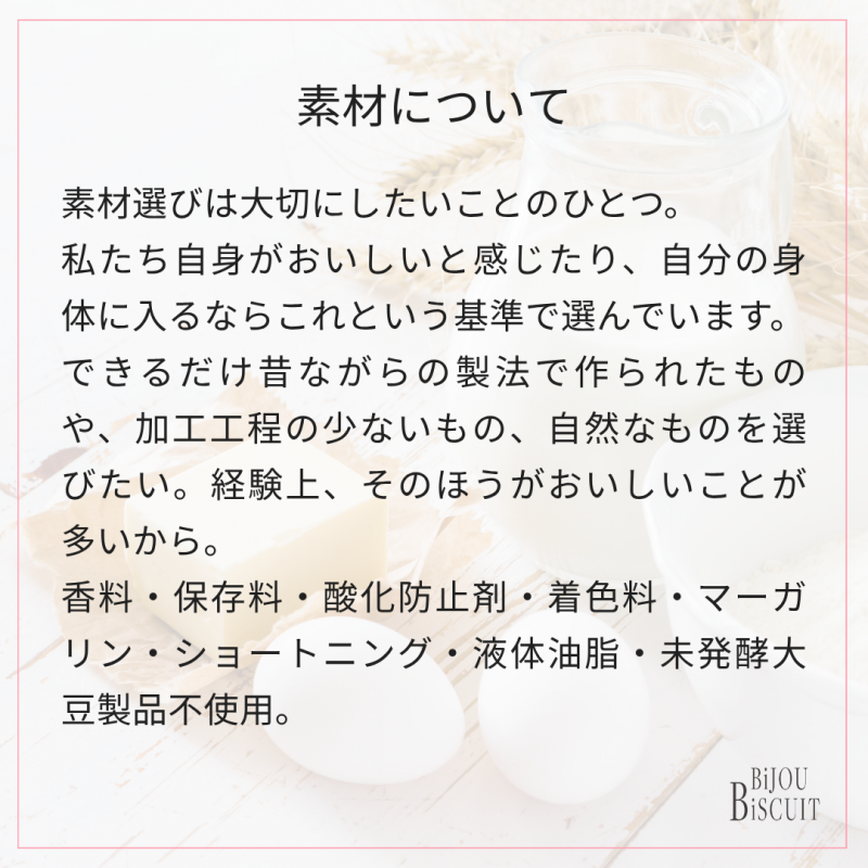 〈原材料〉グラスフェッドバター(ニュージーランド製造)、素焚糖(鹿児島県製造)、平飼卵、米粉(新潟製造)、アーモンドプードル(スペイン製造)、りんご(長野県産、減農薬栽培)、バニラビーンズ(インドネシア製造)、自然塩(沖縄製造)