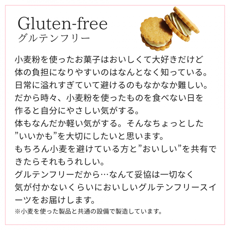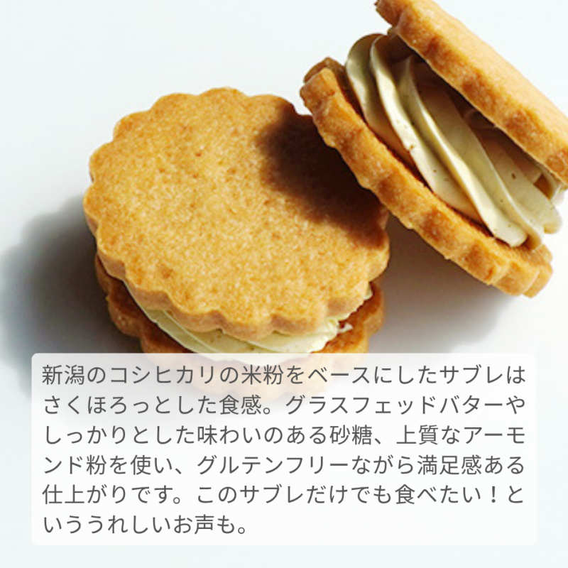 新潟のコシヒカリの米粉をベースにしたサブレはさくほろっとした食感。グラスフェッドバターやしっかりとした味わいのある砂糖、上質なアーモンド粉を使い、グルテンフリーながら満足感ある仕上がりです。このサブレだけでも食べたい!といううれしいお声も。